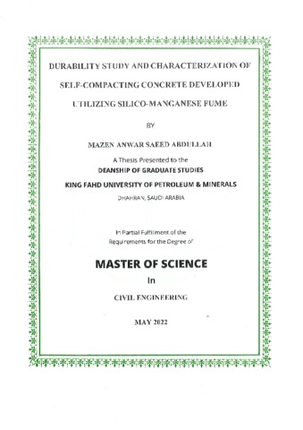 DURABILITY STUDY AND CHARACTERIZATION OF SELF-COMPACTING CONCRETE DEVELOPED UTILIZING SILICO-MANGANESE FUME. Masters thesis, King Fahd University of Petroleum and Minerals.