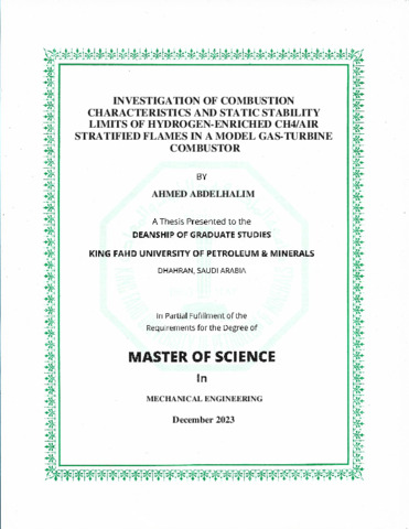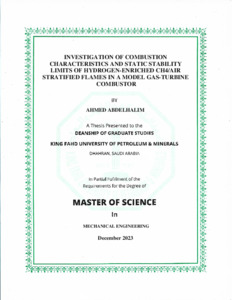 Investigation of Combustion Characteristics and Static Stability Limits of Hydrogen-Enriched CH4/Air Stratified Flames in a Model GasTurbine Combustor. Masters thesis, King Fahd University of Petroleum and Minerals.