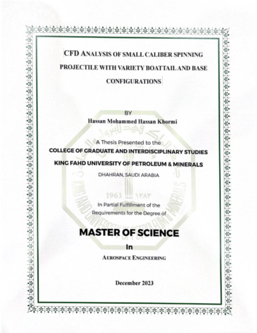 CFD Analysis of Small Caliber Spinning Projectile with Variety Boattail and Base Configurations. Masters thesis, King Fahd University of Petroleum and Minerals.