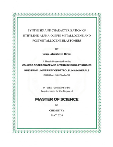 SYNTHESIS AND CHARACTERIZATION OF ETHYLENE-ALPHA-OLEFIN METALLOCENE AND POSTMETALLOCENE ELASTOMERS. Masters thesis, King Fahd University of Petroleum and Minerals.