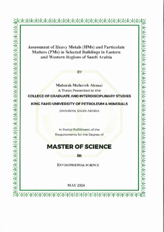 Assessment of Heavy Metals (HMs) and Particulate Matters (PMs) in Selected Buildings in Eastern and Western Regions of Saudi Arabia. Masters thesis, King Fahd University of Petroleum and Minerals.