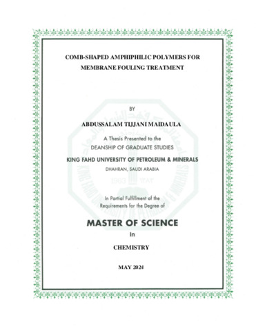 COMB-SHAPED AMPHIPHILIC POLYMERS FOR MEMBRANE FOULING TREATMENT. Masters thesis, King Fahd University of Petroleum and Minerals.