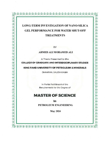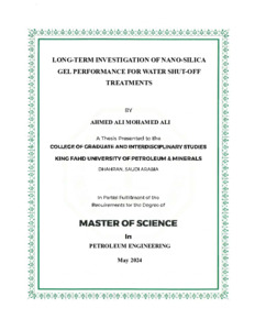 LONG-TERM INVESTIGATION OF NANO-SILICA GEL PERFORMANCE FOR WATER SHUT-OFF TREATMENTS. Masters thesis, King Fahd University of Petroleum and Minerals.