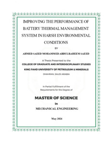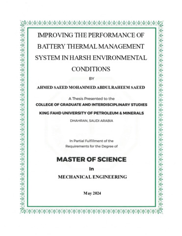 IMPROVING THE PERFORMANCE OF BATTERY THERMAL MANAGEMENT SYSTEM IN HARSH ENVIRONMENTAL CONDITIONS. Masters thesis, King Fahd University of Petroleum and Minerals.